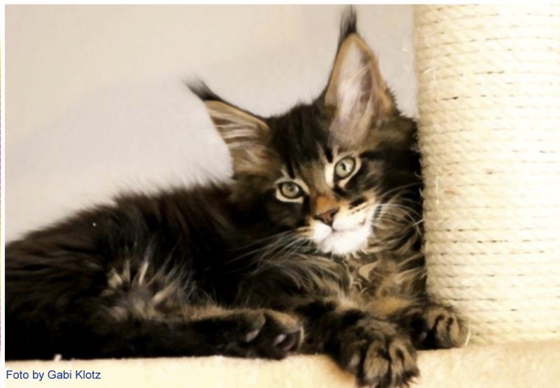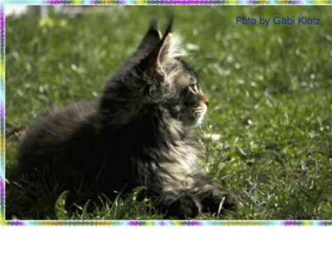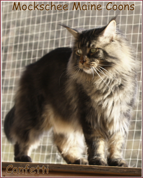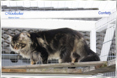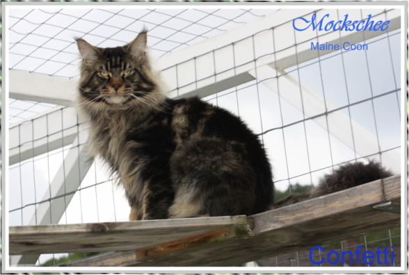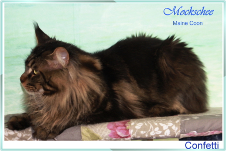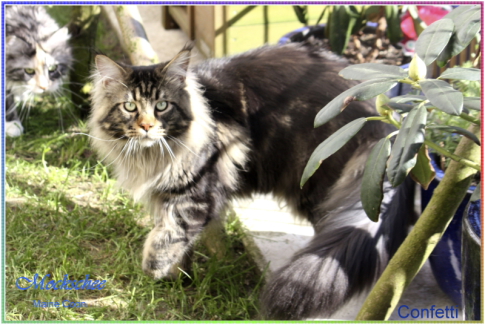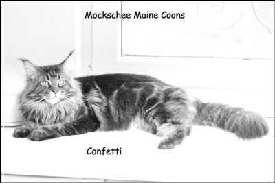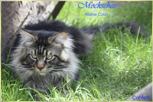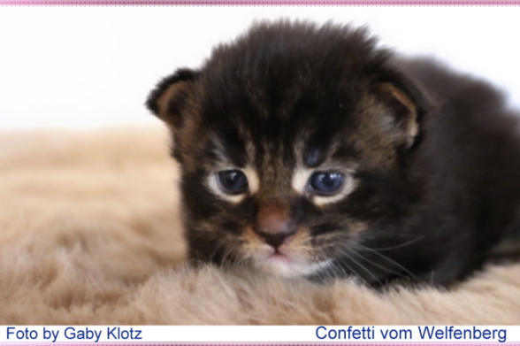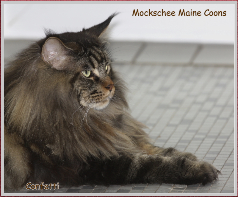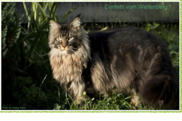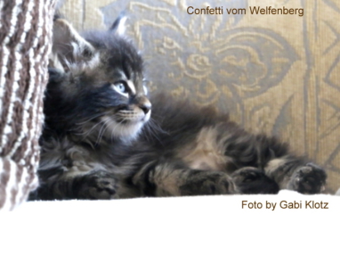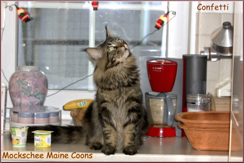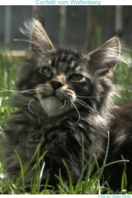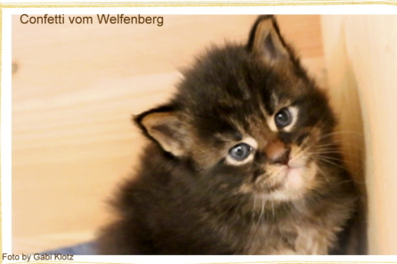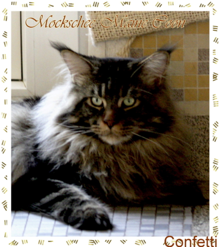 Confetti, das war Liebe auf den ersten Blick! Als ich ein Bild von ihm sah, auf welchem er zum Verkauf stand, war es um mich geschehen! So einen Kater habe ich mir für meine hübschen Mädels gewünscht. Der Stammbaum paßte auch und so fuhren wir nach Peiting wo der süße Schatz auf mich wartete. Gabi mochte ihn gar nicht gerne hergeben, denn er ist ein süßer Tropf, wie sie ihn nennt! Er lebte dort mit seinen Mädels zusammen und markierte nicht und ist überhaupt nur artig. Tatsächlich ist er hier genauso, ein Mama-Kind, immer in dem Zimmer, in welchem ich bin. Nachts in meinem Schlafzimmer und tagsüber überall. Er ist ganz lieb zu meinen vorhandenen Kätzchen einschließlich den Kastraten. Sie fauchten ihn zunächst immerzu an, aber er bleibt einfach sitzten und singt, so dass sie bald gemerkt haben, dass er friedfertig ist. Ich hoffe so sehr, dass es so bleibt und er immer überhall mit herumlaufen kann, mein Tüffelchen!!!!