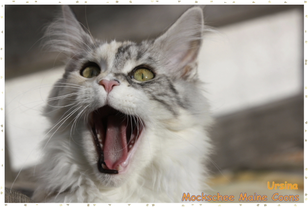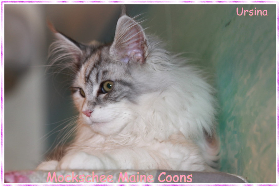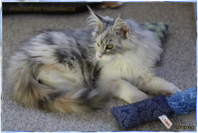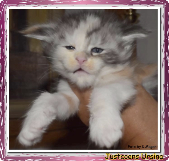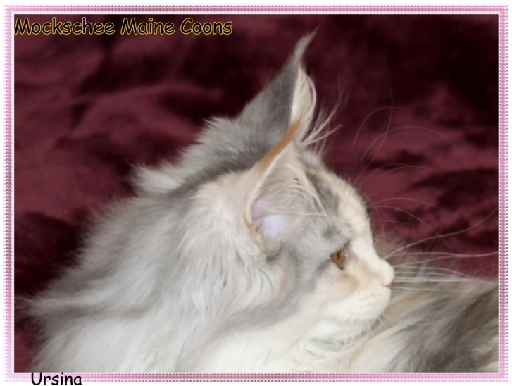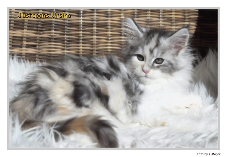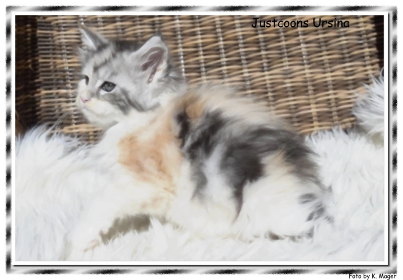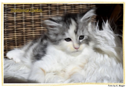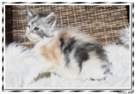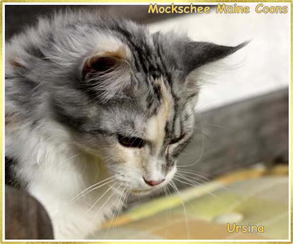Ursina heißt die kleine Bärin und der Name ist Programm! Sie ist absolut selbstbewußt und dabei vollkommen lieb. Sie bewegt sich im ganzen Hause, als wäre sie schon immer hier. Auch das Knurren und Fauchen einiger anderer Katzen ignoriert sie einfach! Sie ist sooo schmusig und läßt sich sogar gerne kämmen! Ein ganz, ganz tolles Kätzchen! Ich bin schon sehr gespannt, wie sie sich entwickeln wird. Leider ist es ja nun nichts mit dem Traum von Coonie-Babys mehr! Aber sie ist trotzdem meine Seelenkatze!