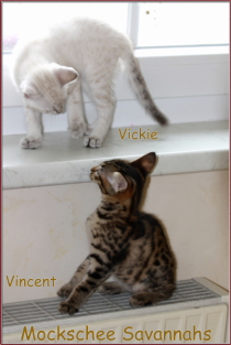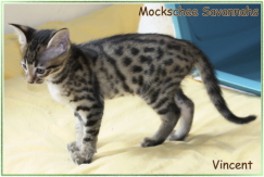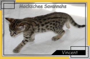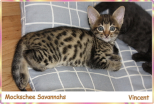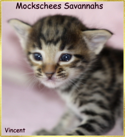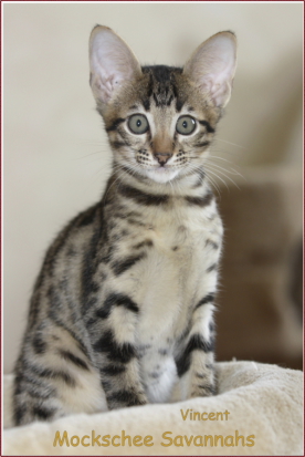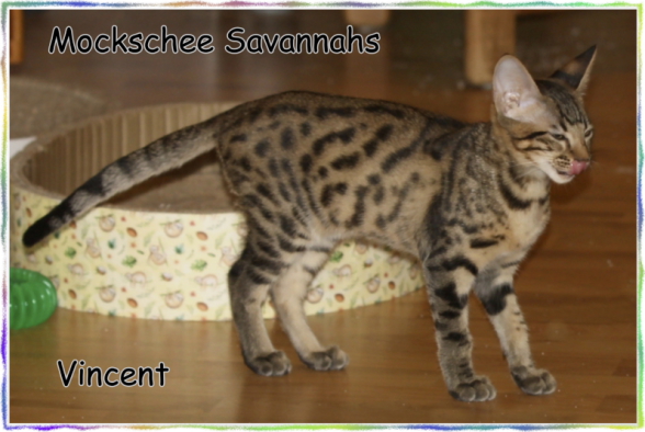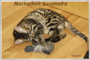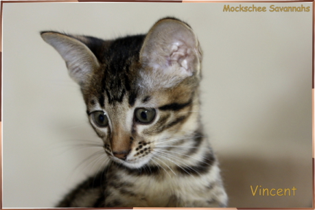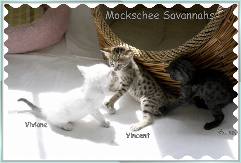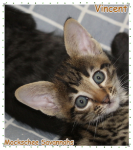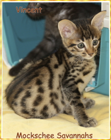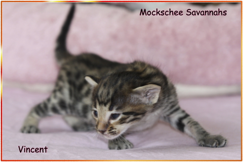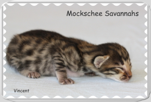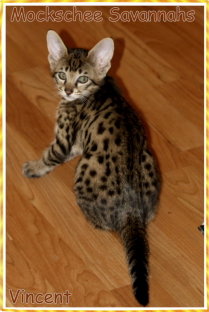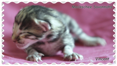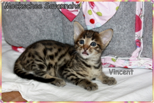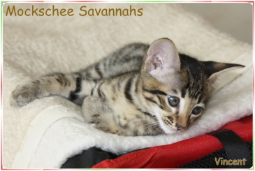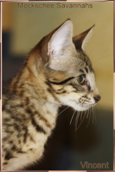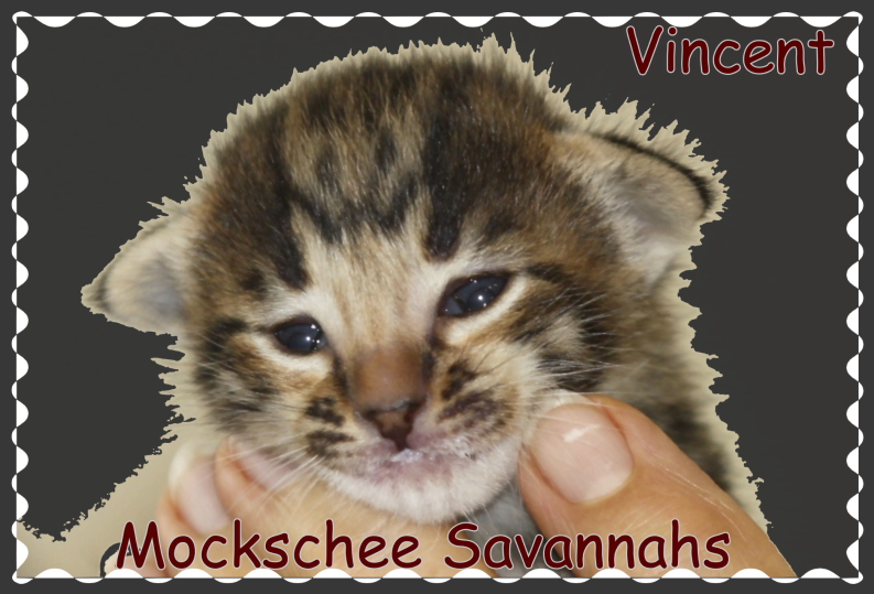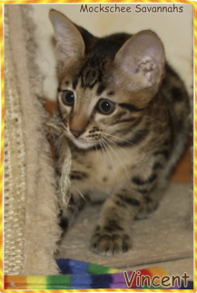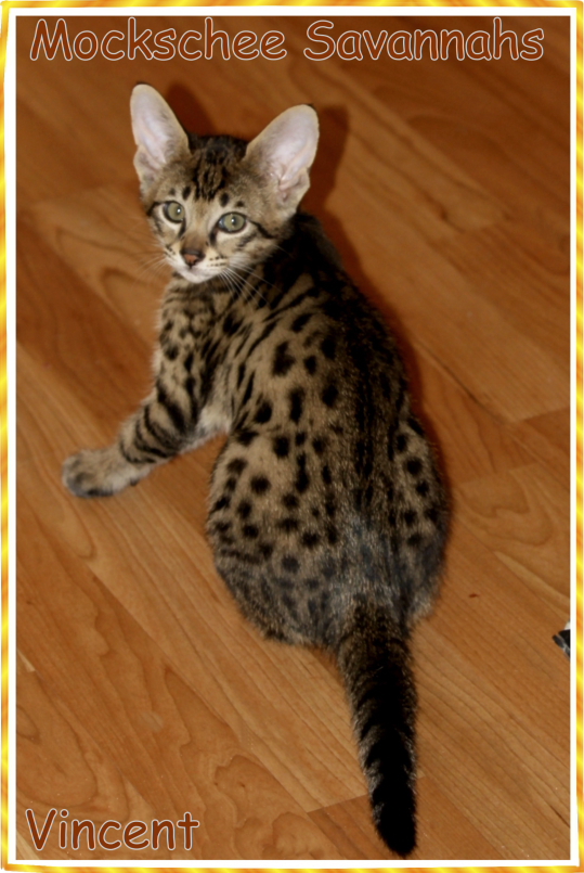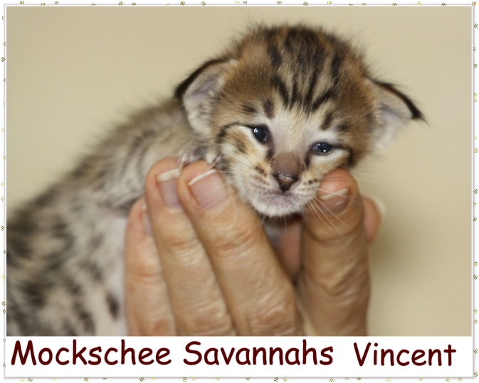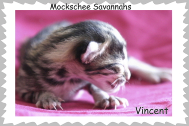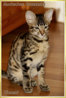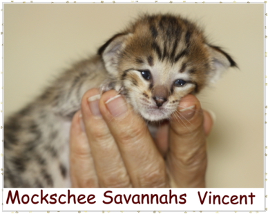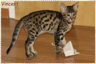 Vincent, der Sieger, der Siegreiche ist ein Kater mit schönen deutlichen Spots! Die Farbe ist variabel, wir werden sehen, wie er sich entwickelt! Auf jeden Fall ist er sehr schön gezeichnet! Mein kleiner Schatz ist ein Flaschenkind geworden. Nun ja, nicht ganz, aber 3 Fläschchen am Tag will er schon. Deshalb ist er ganz, ganz schmusig und immer tiefenentspannt wenn man ihn hochnimmt!