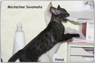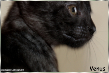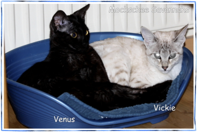 Sie so geblieben, wo immer ich bin, Venus ist da! Sie kommt sofort auf den Schoß, wenn ich mich setze und will immerzu bei mir liegen und gestreichelt werden. Auch versucht sie alles zu fressen, was ich esse, es ist unmöglich irgendwas Leckeres allein zu essen, schon gar nicht mit Sahne! Sie hat sehr gut aufgeholt und wiegt nun genausoviel wie ihre Schwester. Auch läßt sie sich nichts mehr von Vickie gefallen und ist sehr wehrhaft geworden. In letzter Zeit hängen sie immerzu zusammen und schlafen auch meisten aneinandergekuschelt in einem Körbchen, falls ich nicht greifbar bin.